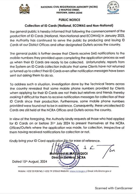 As a result, numerous ID cards remain uncollected at NCRA offices and outlets across the country. The Authority is now calling on all individuals who applied for ID cards on or before July 31, 2024, to visit the NCRA offices or outlets where they applied to collect their cards, regardless of whether they have received a notification.