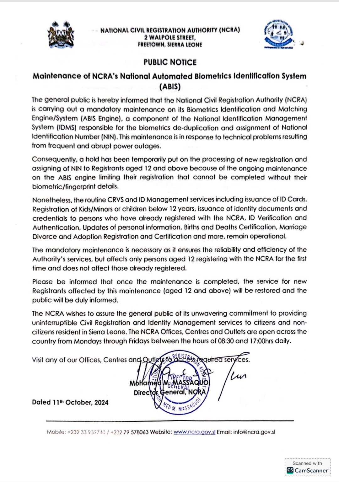 The NCRA reiterated its commitment to delivering uninterrupted civil registration and identity management services across Sierra Leone.