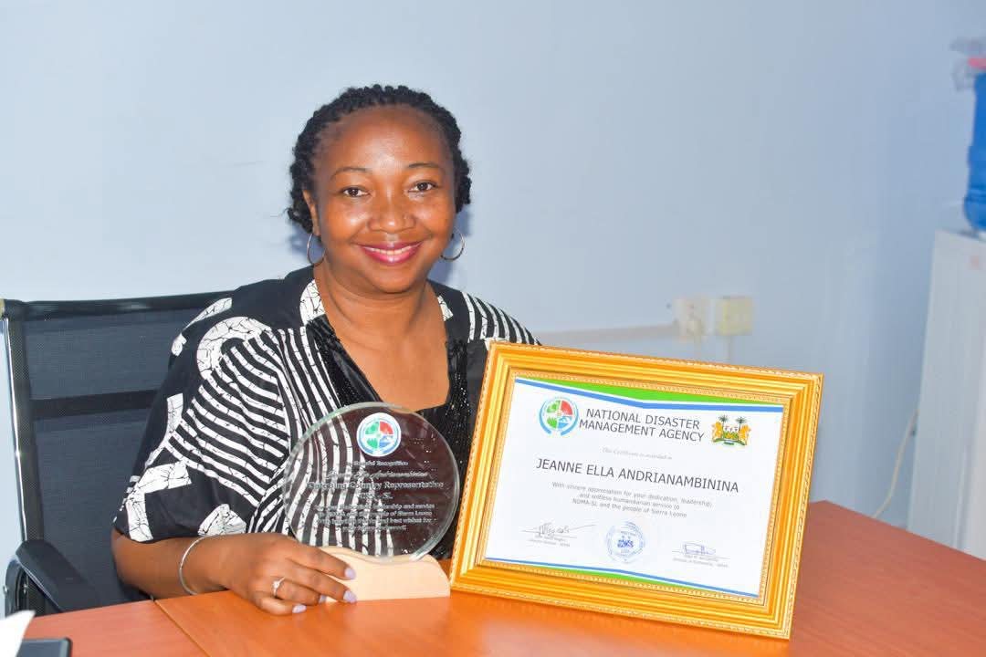 Presenting a plaque and a certificate of appreciation on behalf of the Director General and the Agency, the Director of Partnerships at NDMA, Mr. Soko Kai-Samba, commended Madam Andrianambinina for her dedication, exemplary leadership, and selfless humanitarian service to NDMA and the people of Sierra Leone.