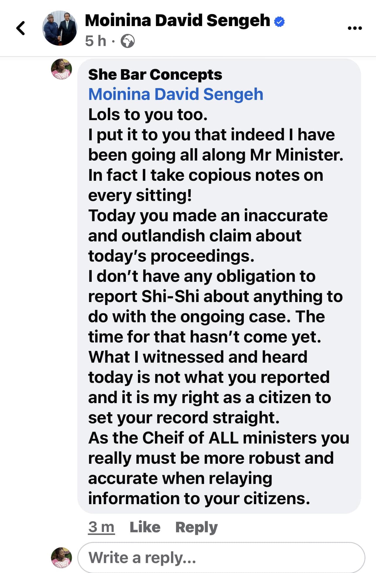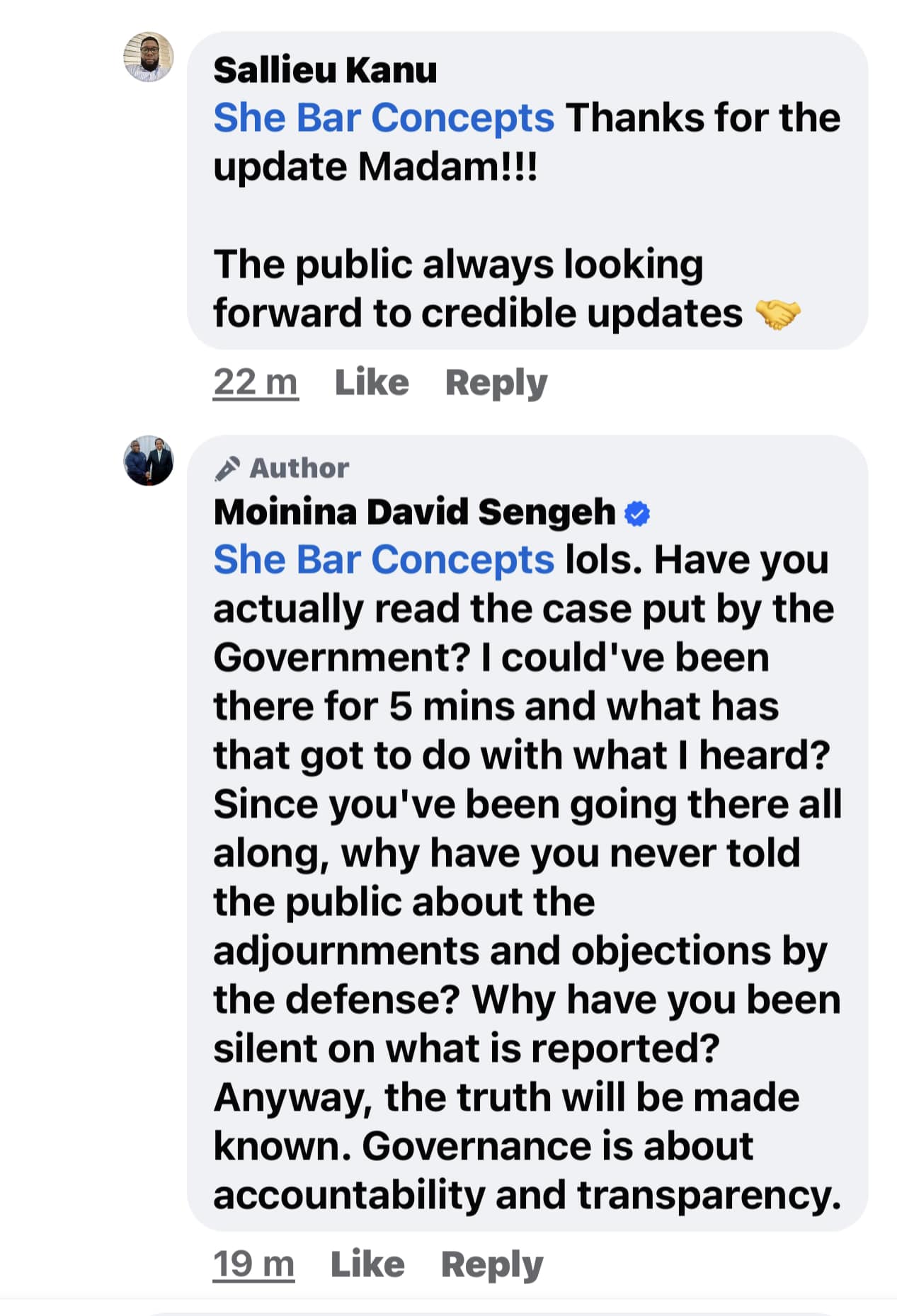 Undeterred, She Bar Concept’s CEO replied, asserting her consistent attendance at tribunal hearings and her right as a citizen to set the record straight. She refuted Dr. Sengeh’s characterization of the proceedings, highlighting her practice of taking detailed notes during every sitting. She defended her decision not to report on ongoing case details, asserting that the time for such disclosures had not yet arrived.
