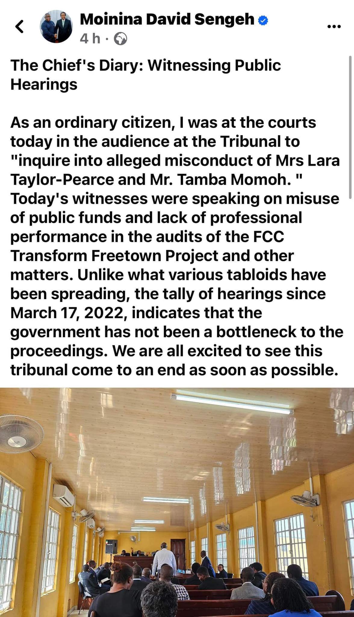 Dr. Sengeh’s Facebook post highlighted the witnesses’ discussions on the misuse of public funds and lack of professional performance in various audits, including those related to the Transform Freetown Project. He expressed excitement about the tribunal’s progress, refuting claims that the government was hindering proceedings.