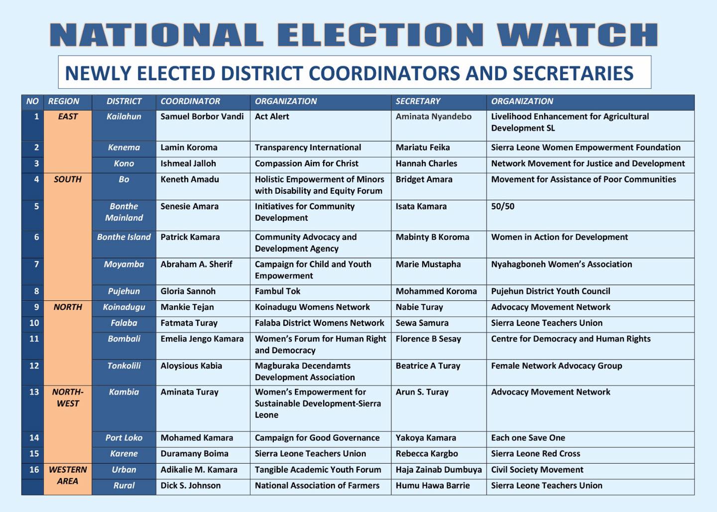 According to NEW, the newly elected district teams will undertake the review and verification of Chiefdom Focal Persons, with the authority to appoint replacements where necessary in a bid to enhance local representation and coordination.