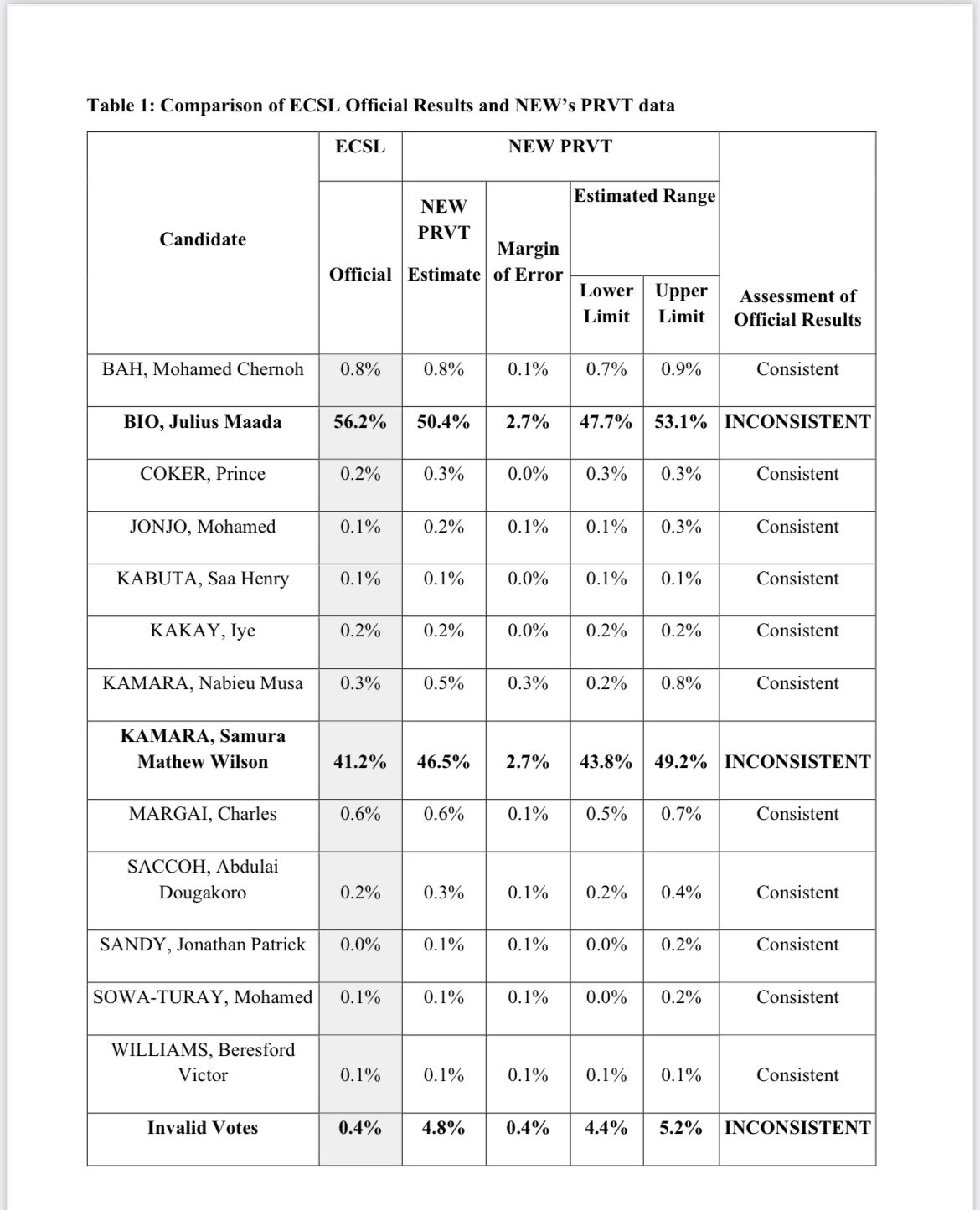 According to NEW, the candidate of the Sierra Leone People’s Party (SLPP) should receive between 47.7% and 53.1% of the vote while ECSL’s official result is 56.1%; The candidate of the All People’s Congress (APC) should receive between 43.8% and 49.2% of the vote while ECSL’s official result is 41.2%.