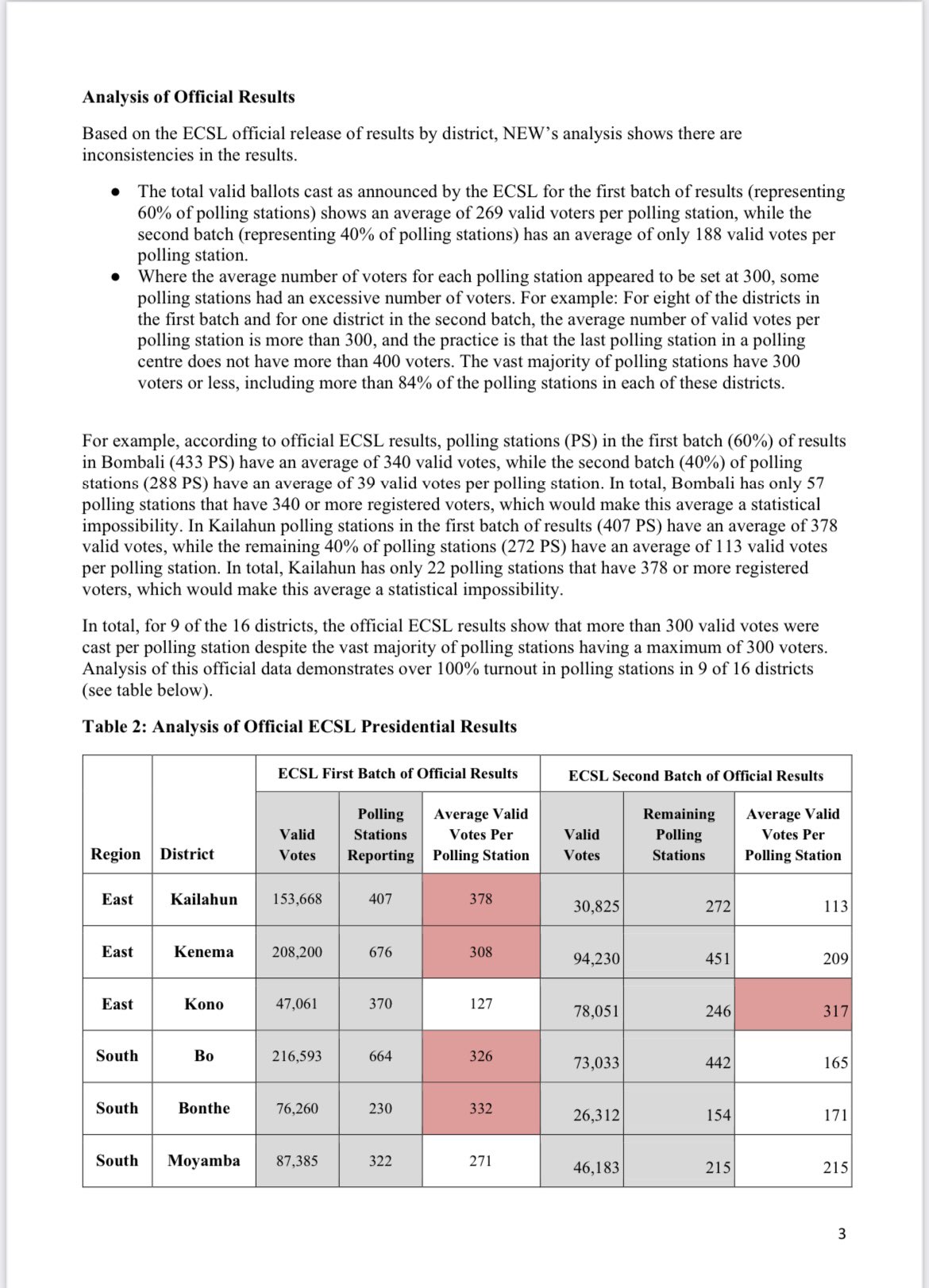 For example, according to official ECSL results, polling stations (PS) in the first batch (60%) of results in Bombali (433 PS) have an average of 340 valid votes, while the second batch (40%) of polling stations (288 PS) have an average of 39 valid votes per polling station. In total, Bombali has only 57 polling stations that have 340 or more registered voters, which would make this average a statistical impossibility. In Kailahun polling stations in the first batch of results (407 PS) have an average of 378 valid votes, while the remaining 40% of polling stations (272 PS) have an average of 113 valid votes per polling station. In total, Kailahun has only 22 polling stations that have 378 or more registered voters, which would make this average a statistical impossibility.