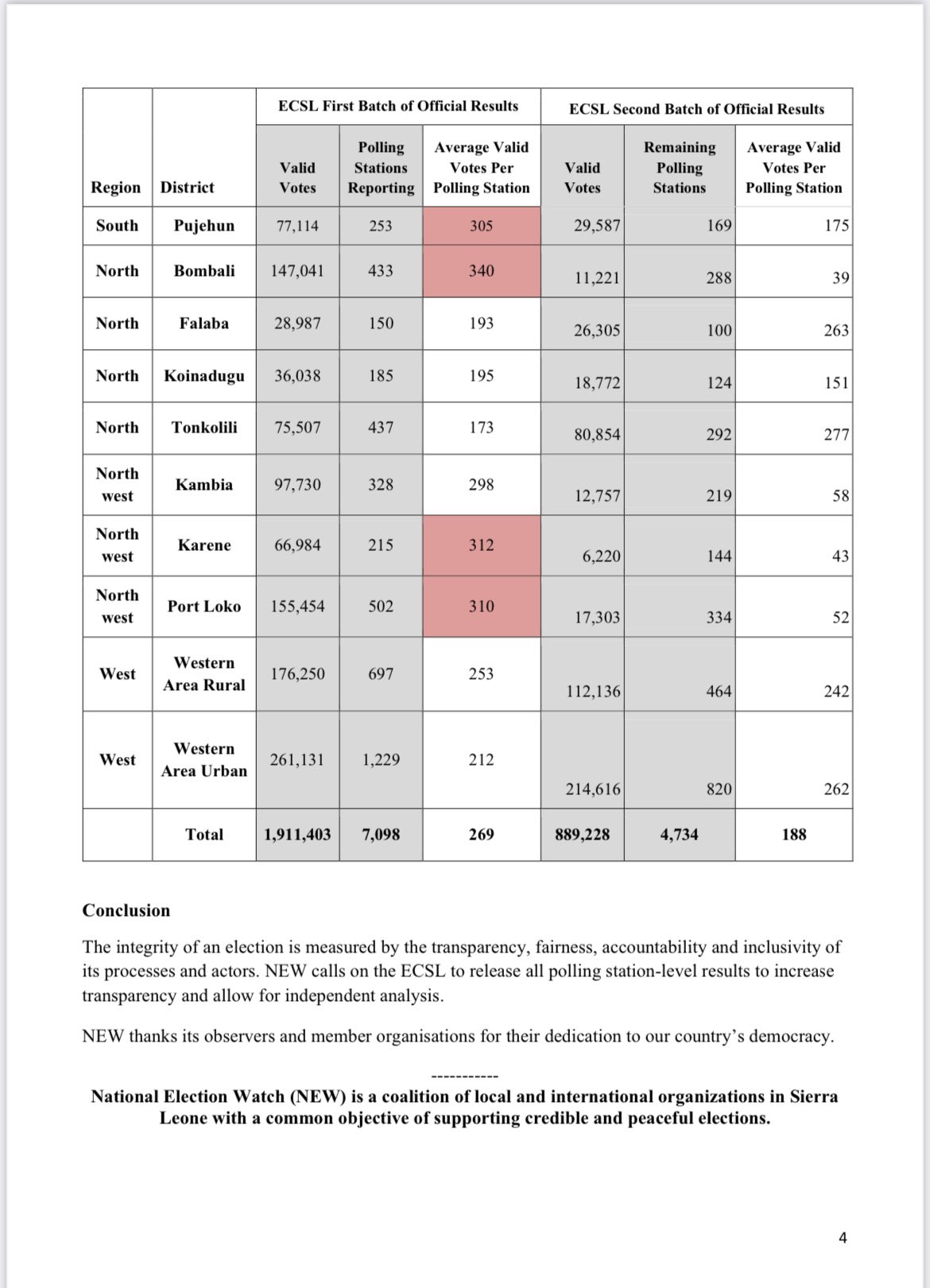 ● The total valid ballots cast as announced by the ECSL for the first batch of results (representing 60% of polling stations) shows an average of 269 valid voters per polling station, while the second batch (representing 40% of polling stations) has an average of only 188 valid votes per polling station.