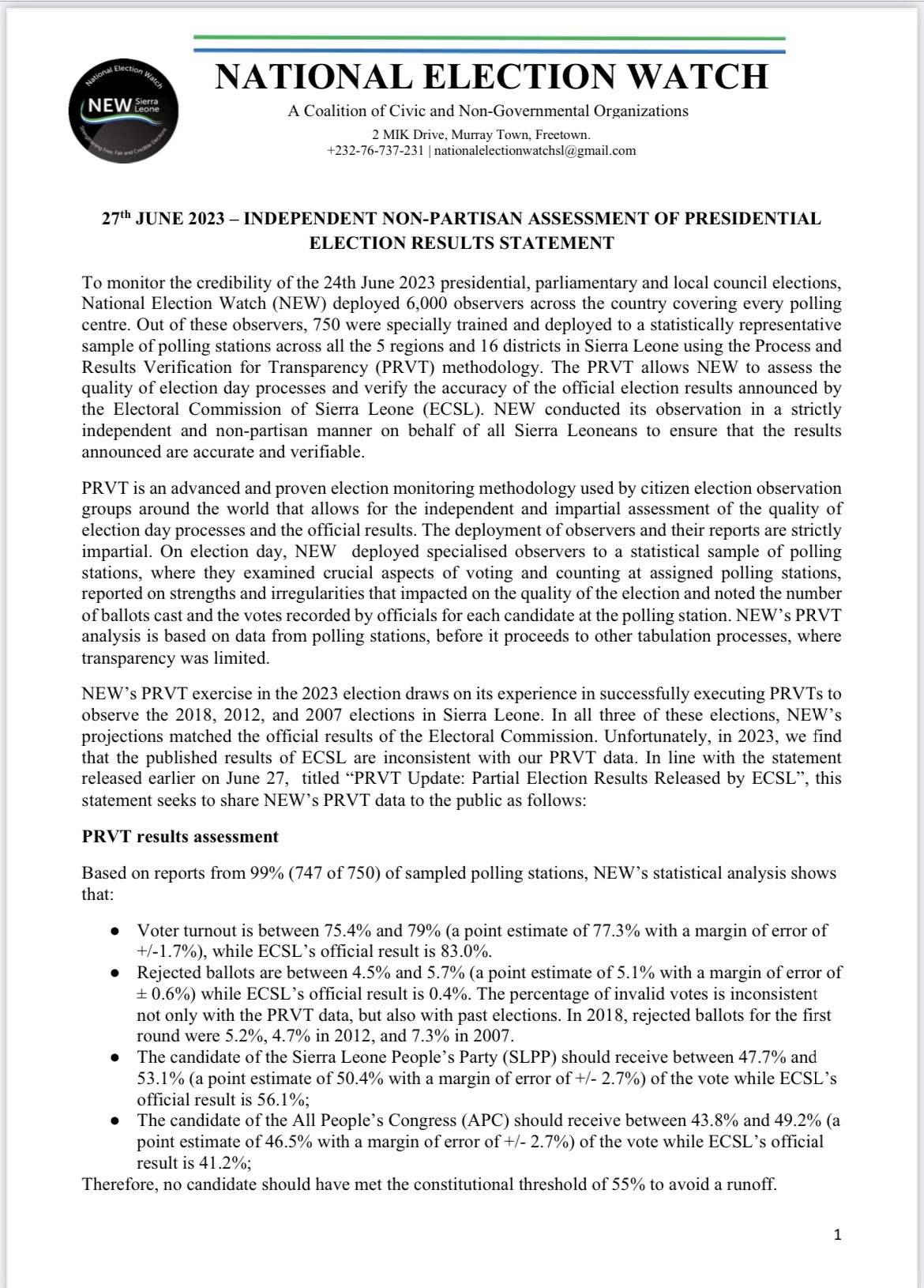 To monitor the credibility of the 24th June 2023 presidential, parliamentary and local council elections, National Election Watch (NEW) deployed 6,000 observers across the country covering every polling centre. Out of these observers, 750 were specially trained and deployed to a statistically representative sample of polling stations across all the 5 regions and 16 districts in Sierra Leone using the Process and Results Verification for Transparency (PRVT) methodology. The PRVT allows NEW to assess the quality of election day processes and verify the accuracy of the official election results announced by the Electoral Commission of Sierra Leone (ECSL). NEW conducted its observation in a strictly independent and non-partisan manner on behalf of all Sierra Leoneans to ensure that the results announced are accurate and verifiable.