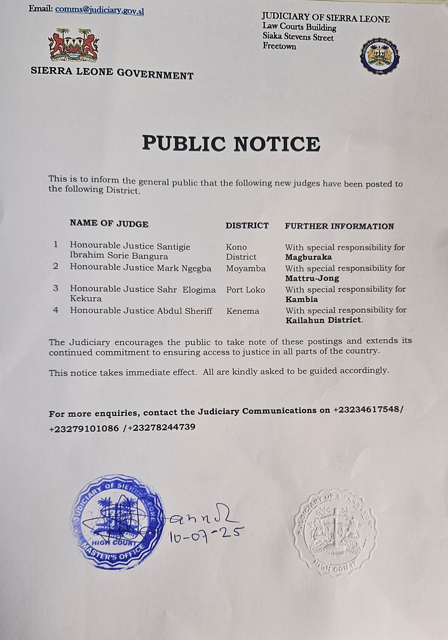 The Judiciary of Sierra Leone has issued a public notice regarding the appointment of new judges to various districts across the country.