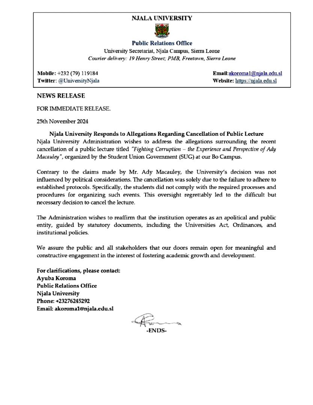Njala University has addressed allegations surrounding the cancellation of a scheduled public lecture by prominent lawyer Ady Macauley, which was to take place on November 25, 2024, at the institution’s Bo Campus.