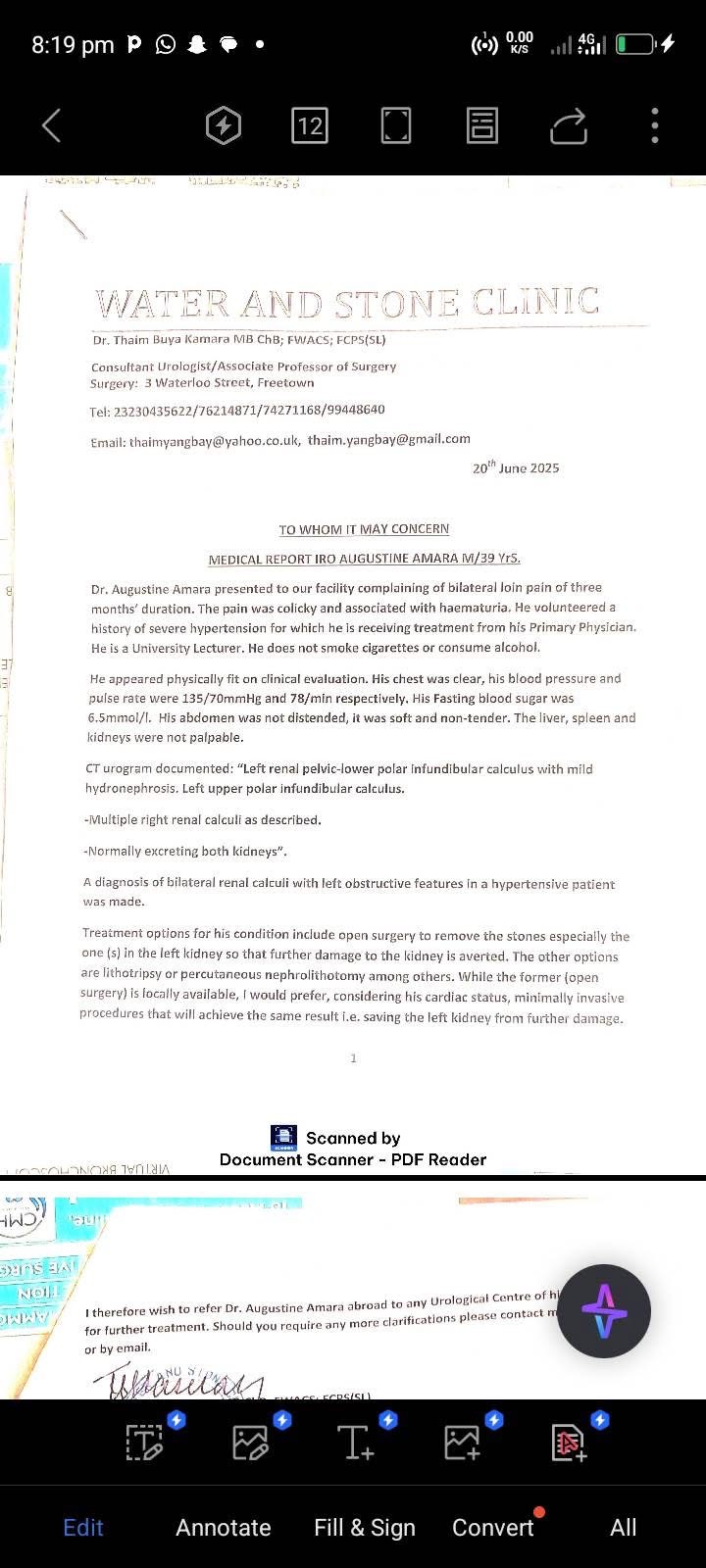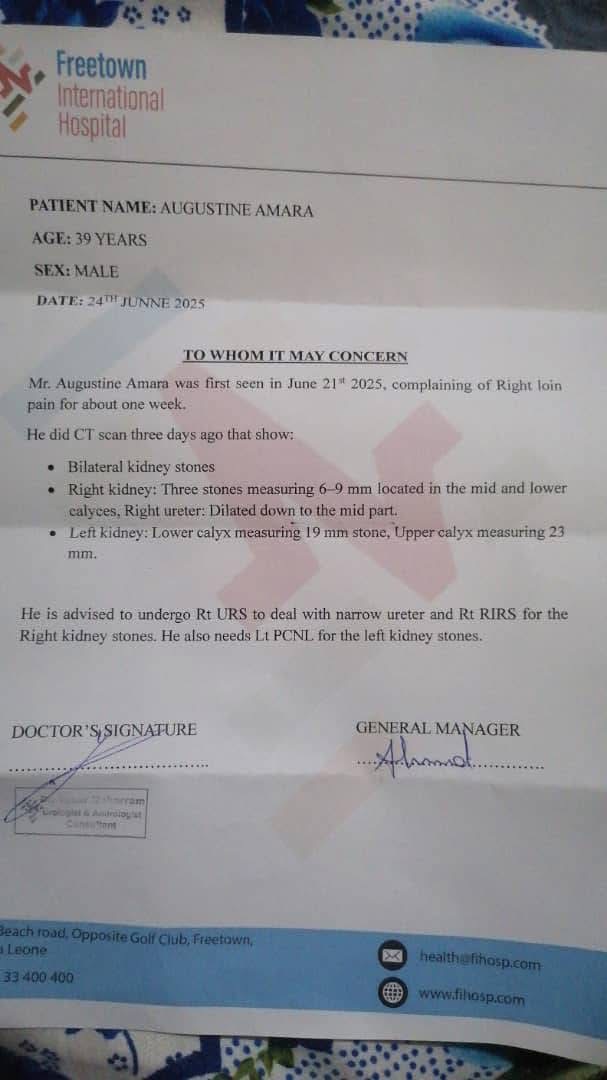 So far, Njala University has contributed $5,000 towards his treatment, while Dr. Amara himself has raised an additional $3,000, bringing the total funds collected to $8,000, which leaves a financial gap of $2,000, not including travel and welfare expenses.