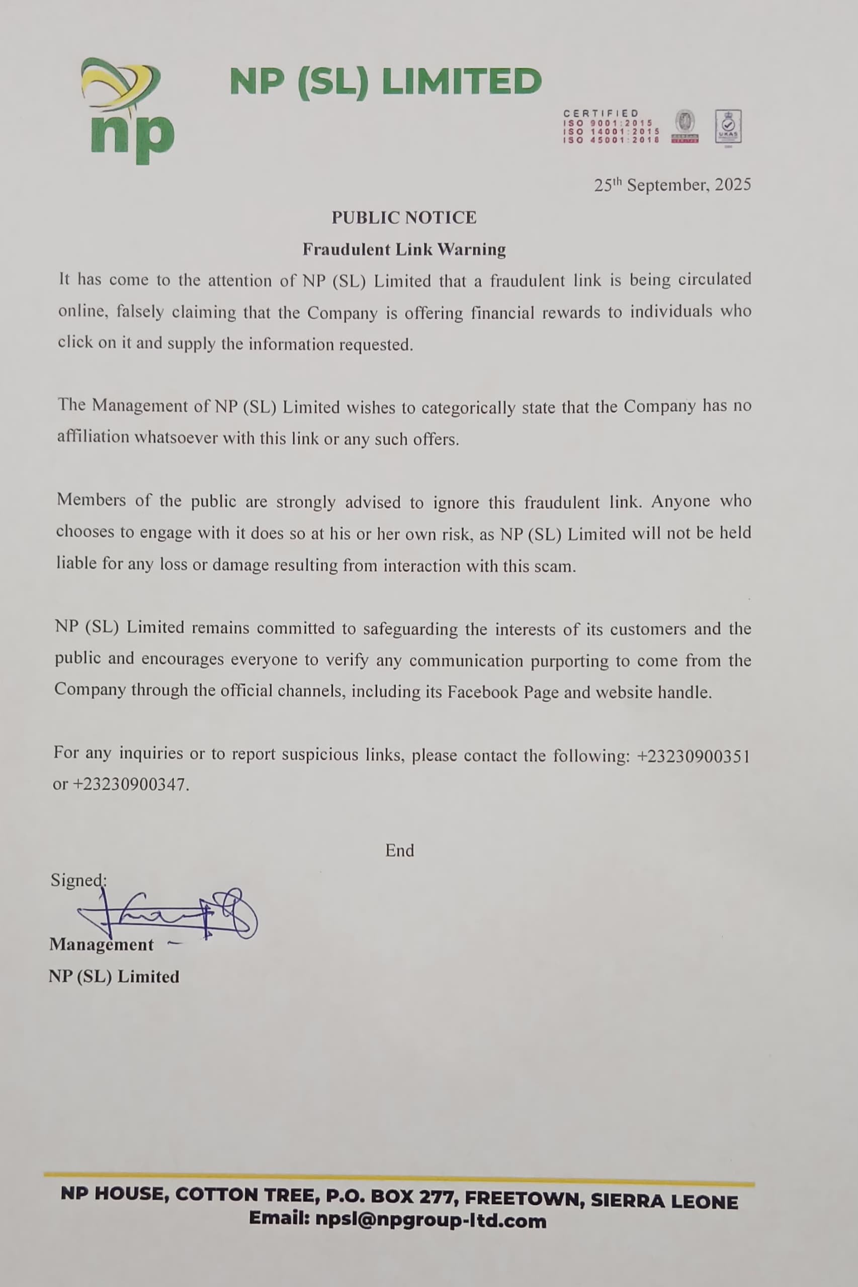 Individuals with inquiries or those wishing to report suspicious links are encouraged to contact NP (SL) Limited at +232 3090 0351 or +232 3090 0347.