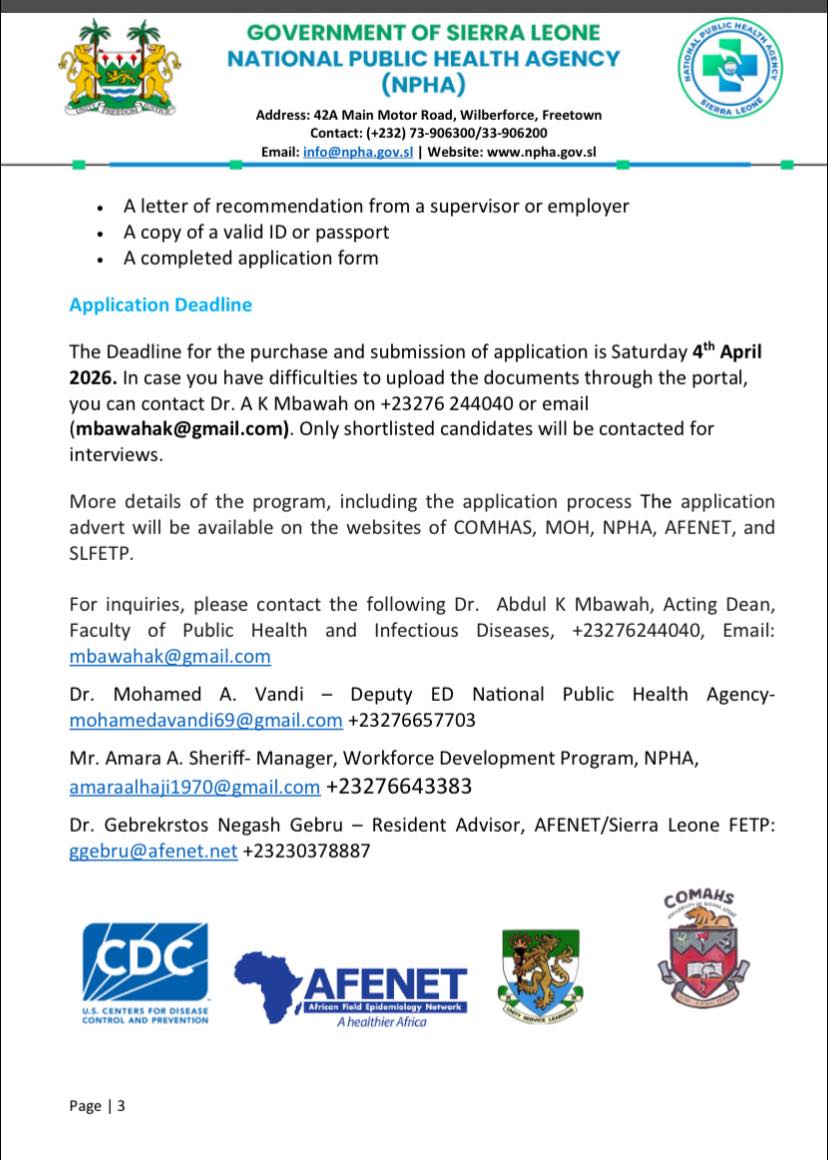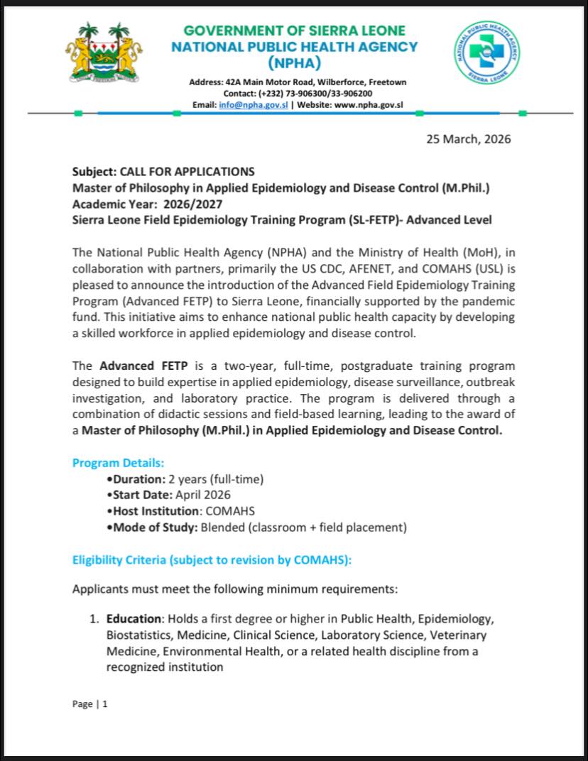Further information on the programme and application procedures will be made available on the websites of COMAHS, MoH, NPHA, AFENET, and the Sierra Leone Field Epidemiology Training Programme (SLFETP).
