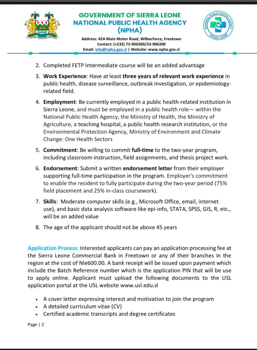 Candidates are also required to have a minimum of three years’ relevant work experience in public health, disease surveillance, outbreak investigation, or related fields. Applicants must be currently employed in a public health-related institution within Sierra Leone, including the National Public Health Agency, Ministry of Health, Ministry of Agriculture, teaching hospitals, research institutions, or the Environmental Protection Agency under the One Health framework.