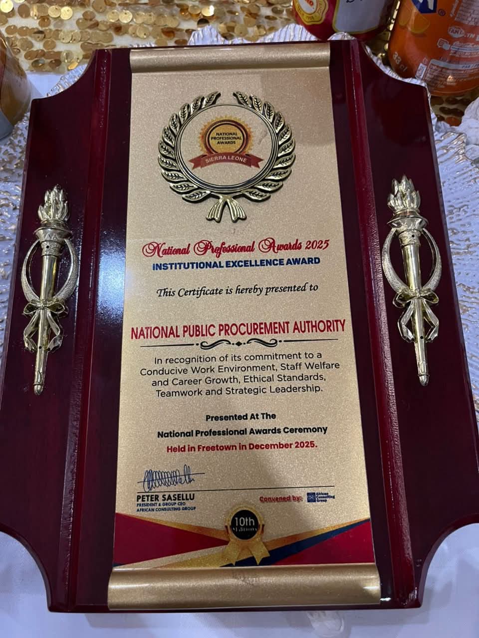 The National Public Procurement Authority (NPPA) has been recognised with the Institutional Excellence Award at the National Professional Awards 2025, held on Sunday, January 18, 2026, in Freetown. The award acknowledges the Authority’s commitment to ethical standards, staff welfare, teamwork, strategic leadership, and institutional reforms.