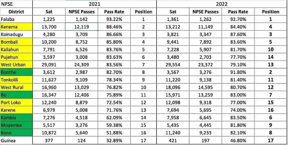 According to him, the 2022 NPSE results reveals thatthe number of children that took the NPSE in Western Area Urban (Freetown) increased between 2021 and 2022 whilst the number of children that took the NPSE in Kenema decreased between 2021 and 2022.