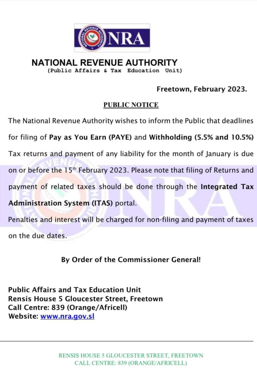 NRA made this announcement in a public notice ordered by the Commissioner General, informing the general public about the deadline set for tax returns and payment of any liability for January 2022.