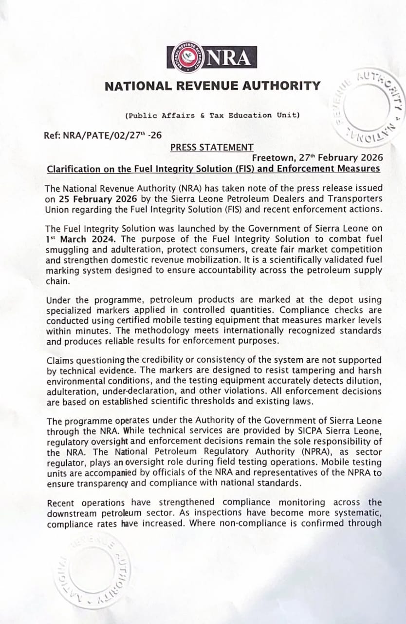 The Fuel Integrity Solution was launched by the Government of Sierra Leone on 1 March 2024. The purpose of the Fuel Integrity Solution is to combat fuel smuggling and adulteration, protect consumers, create fair market competition, and strengthen domestic revenue mobilization. It is a scientifically validated fuel marking system designed to ensure accountability across the petroleum supply chain.