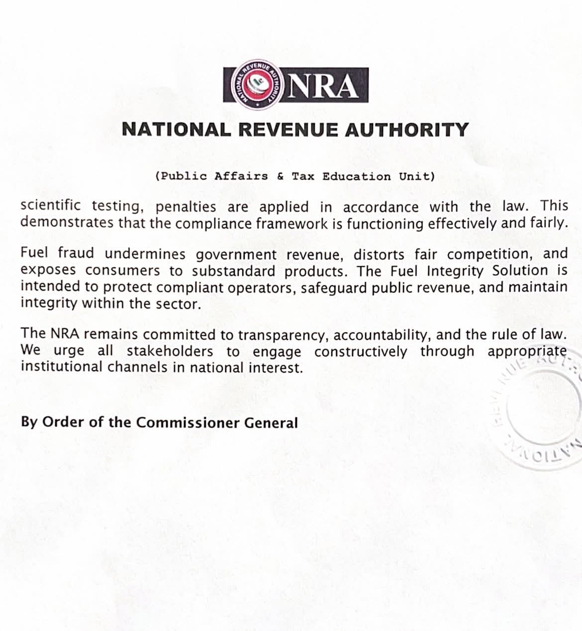 The NRA reaffirmed its commitment to transparency, accountability, and the rule of law. We urge all stakeholders to engage constructively through Plate institutional channels in the national interest.