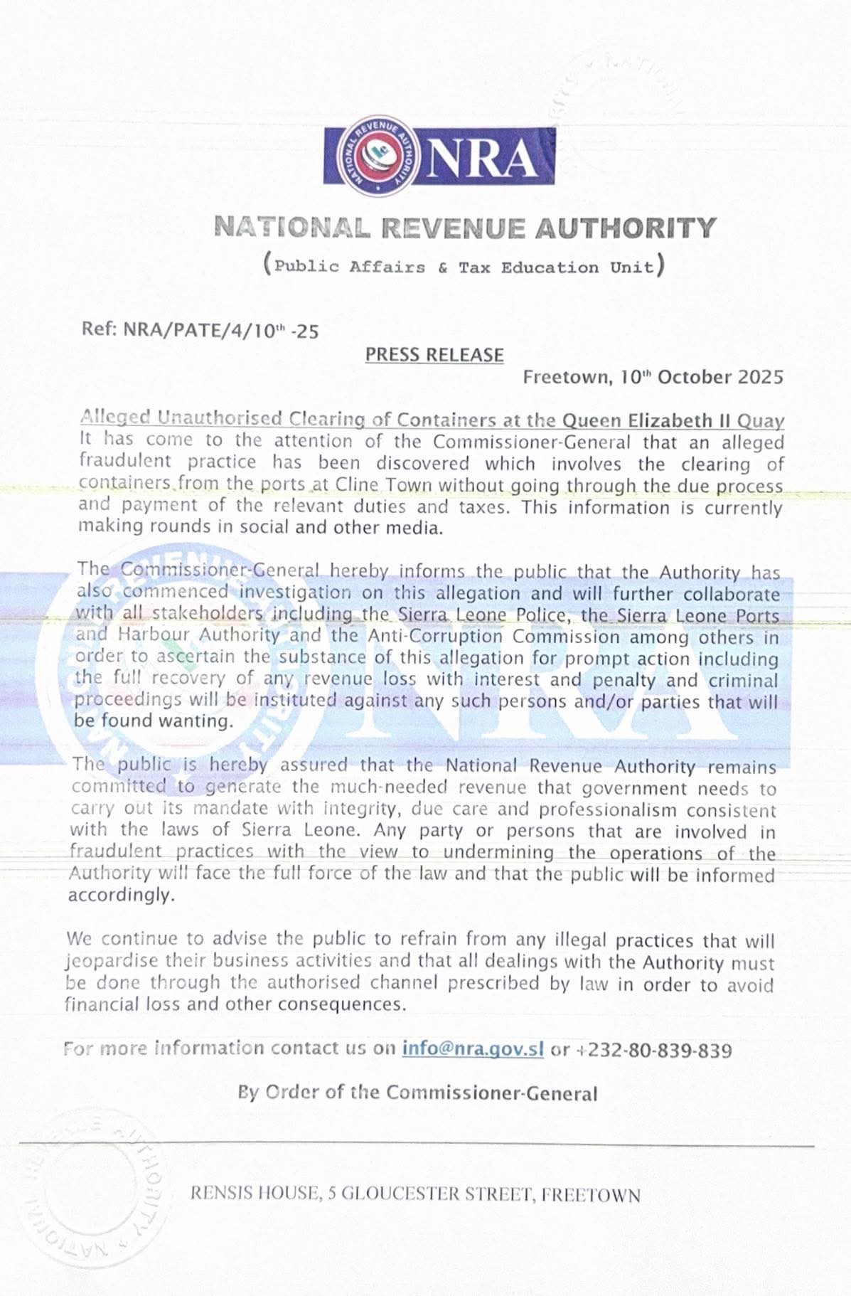 Furthermore, the Commissioner-General informed that the Authority has also commenced investigation on this allegation and will further collaborate with all stakeholders including the Sierra Leone Police, the Sierra Leone Ports and Harbour Authority and the Anti-Corruption Commission among others to ascertain the substance of this allegation for prompt action including the full recovery of any revenue loss with interest and penalty and criminal proceedings will be instituted against any such persons and/or parties that will be found wanting.