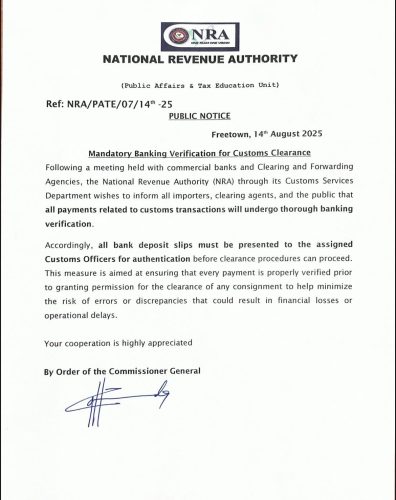 The National Revenue Authority (NRA) has introduced a mandatory banking verification requirement for customs clearance, as per its public notice released on August 14, 2025.