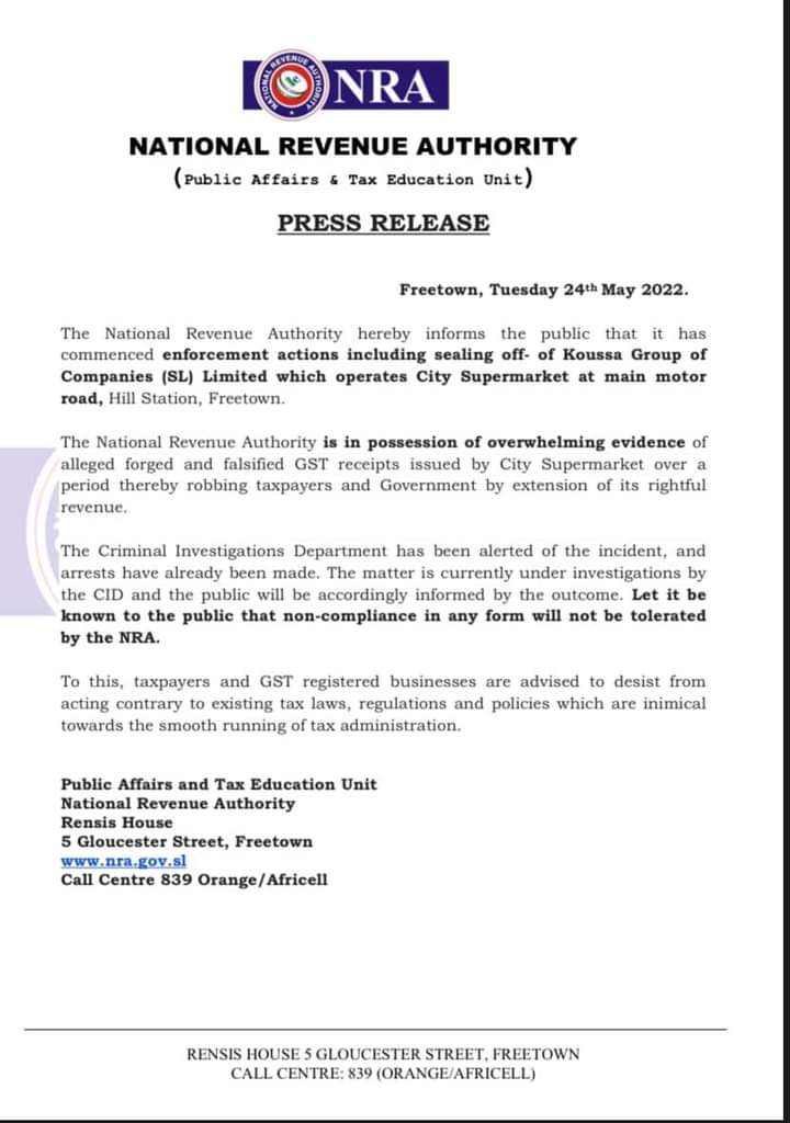 The National Revenue authority has on a Press Released issued out today, the 24th May, 2022,  informed the public that it has commenced enforcement actions including sealing off of Koussa Group of Company (SL) Limited, which operate City Supermarket at main motor road, Hill Station in Freetown.
