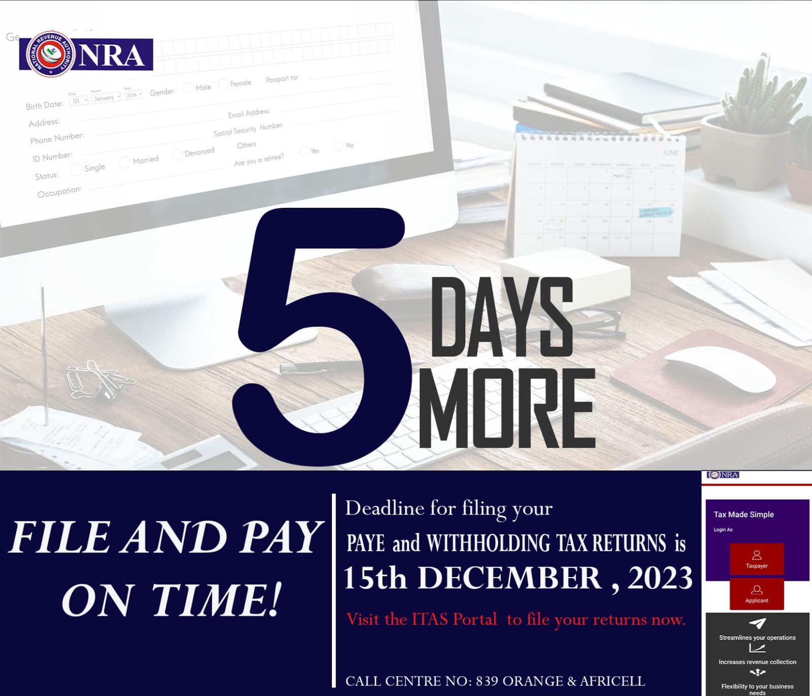 The National Revenue Authority (NRA) has announced that the deadline for individuals to file their PAYE (Pay As You Earn) and withholding tax returns is December 15, 2023. The NRA warned that late filers will face penalties.