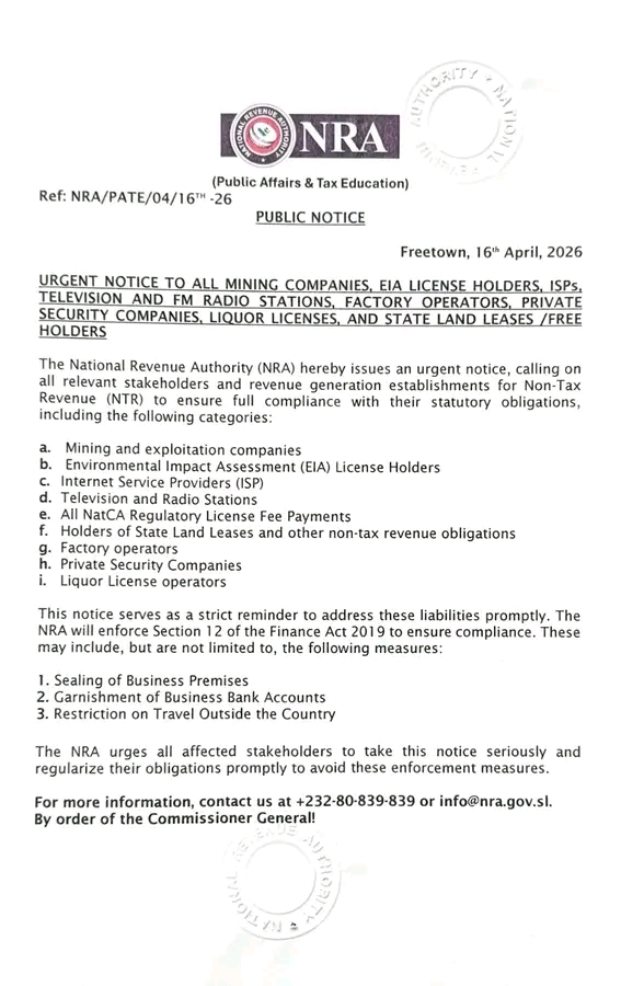 The National Revenue Authority (NRA) has issued an urgent public notice calling on all businesses and institutions liable for Non-Tax Revenue (NTR) to immediately comply with their statutory obligations or face strict enforcement measures.