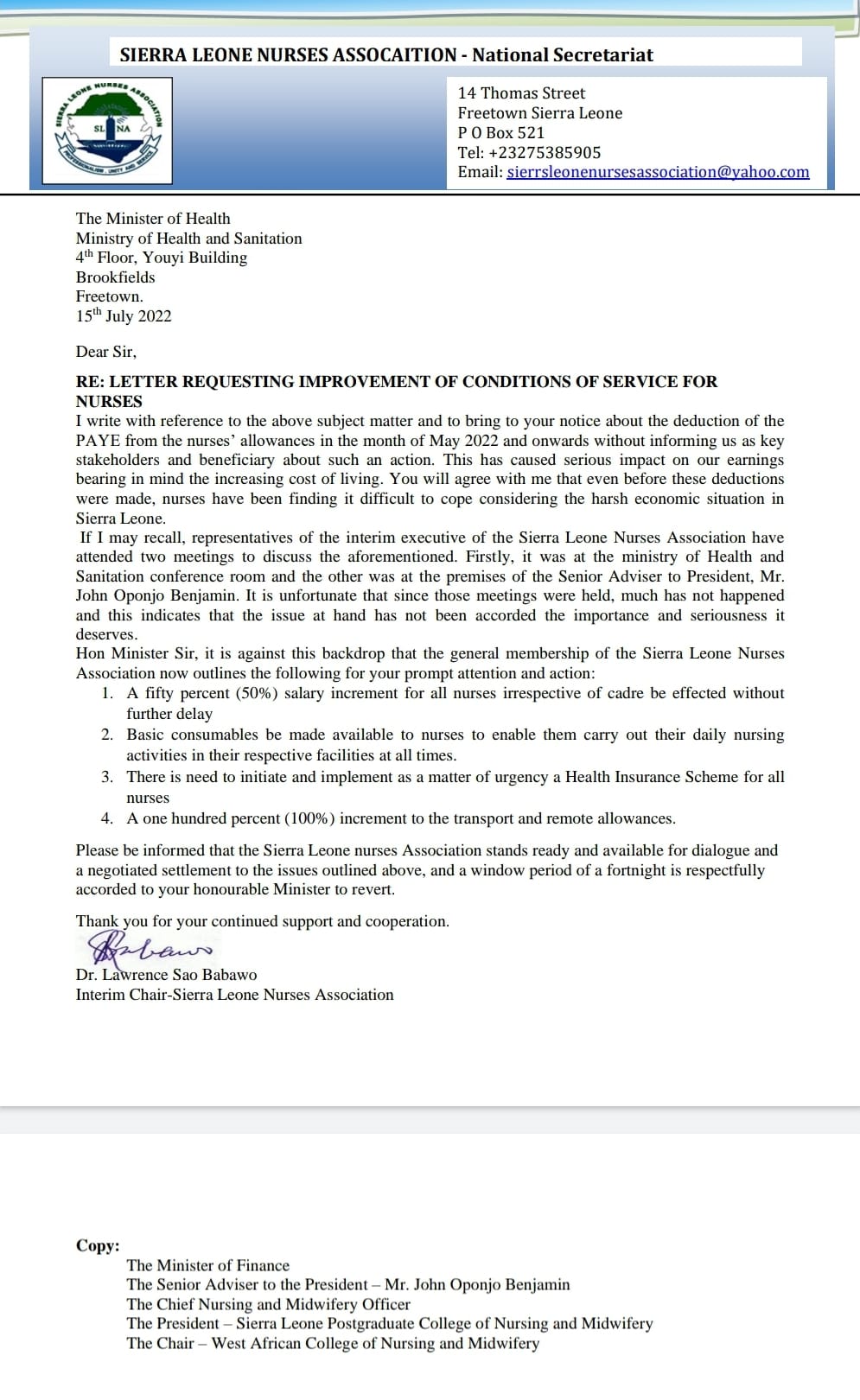 “Please be informed that the Sierra Leone nurses Association stands ready and available for dialogue and a negotiated settlement to the issues outlined above, and a window period of a fortnight is respectfully accorded to your honourable Minister to revert,” they added.