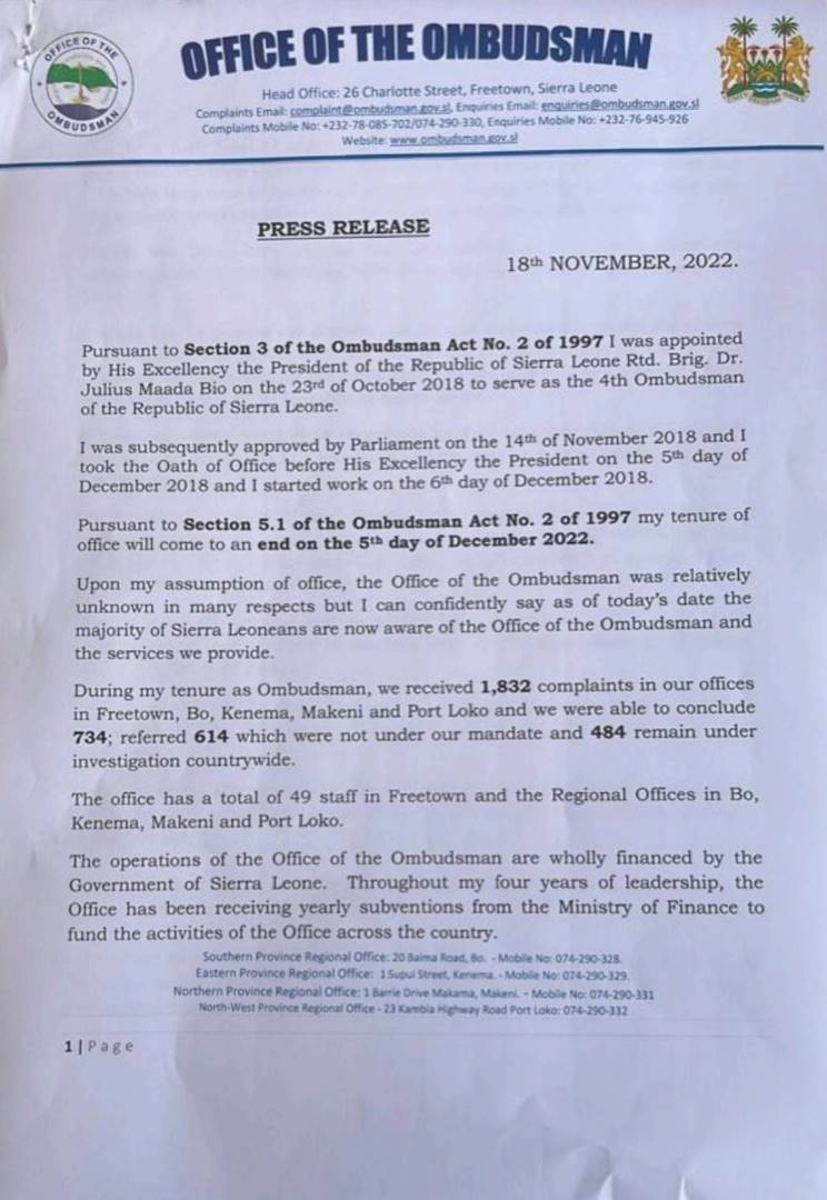 Jenkins-Johnsten Esq. made this statement in a press release issued today, Friday 8 November 2022, as he his tenure as ombudsman ends on December 5th 2022.