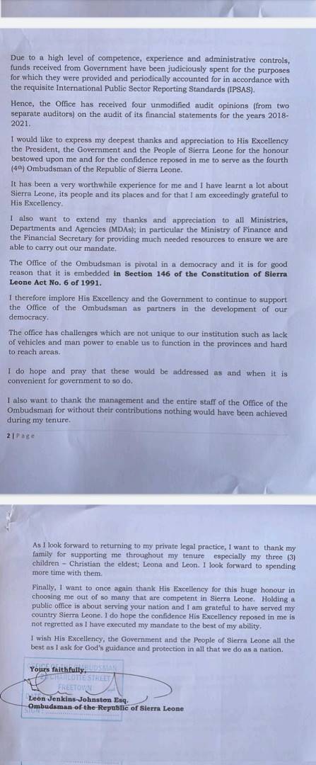 Leon Jenkins-Johnsten Esq. has expressed profound thanks and appreciation to President Julius Maada Bio, the Government and the People of Sierra Leone for honoured and bestowed upon him to serve as the fourth (4) Ombudsman of Sierra Leone. He added that, It has been a very worthwhile experience for him as he had learnt a lot about Sierra Leone, its people and its places.