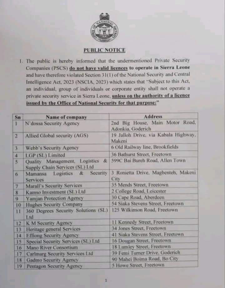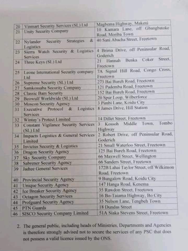 “The public is hereby informed that the undermentioned Private Security Companies (PCSC) do not have valid lincences to operate in Sierra Leone and have therefore violated Section 31 (1) of the National Security and Intelligence Act,” ONS said.