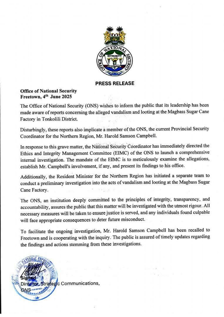 The Office of National Security (ONS) in Sierra Leone released a public statement on June 4, 2025, regarding alleged vandalism and looting at the Magbass Sugar Cane Factory in the Tonkolili district. The ONS acknowledged that one of its staff members, the current Provincial Security Coordinator for the Northern Region, Harold Samson Campbell, has been implicated in the report.