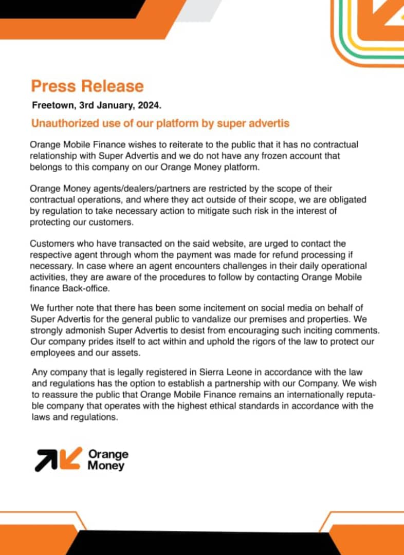 Orange reaffirmed its willingness to partner with legally registered entities in Sierra Leone, asserting its commitment to operating with the highest ethical standards and in compliance with all laws and regulations.