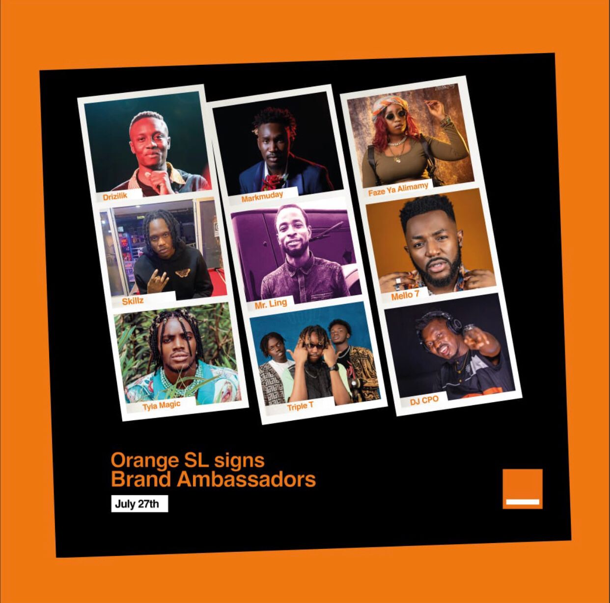 The Nine brand Ambassadors who joined the list of top Stars who have signed lucrative endorsement deals with Orange are Drizilik, Markmuday, Skillz, Tyla Magic, Mello 7 , Faze Ya Alimamy, Triple T, Mr.Ling and DJ CPO.