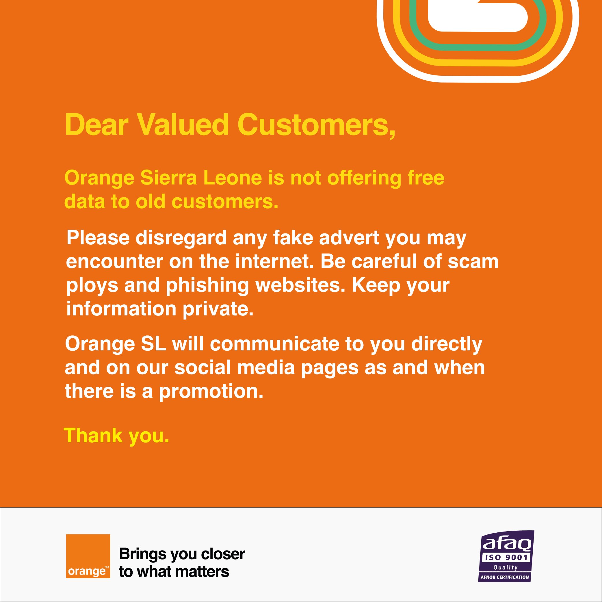 “We are urging customers to disregard any fake advertisements they may encounter online,” Orange Sierra Leone said in a statement. “Be careful of scam ploys and phishing websites.”
