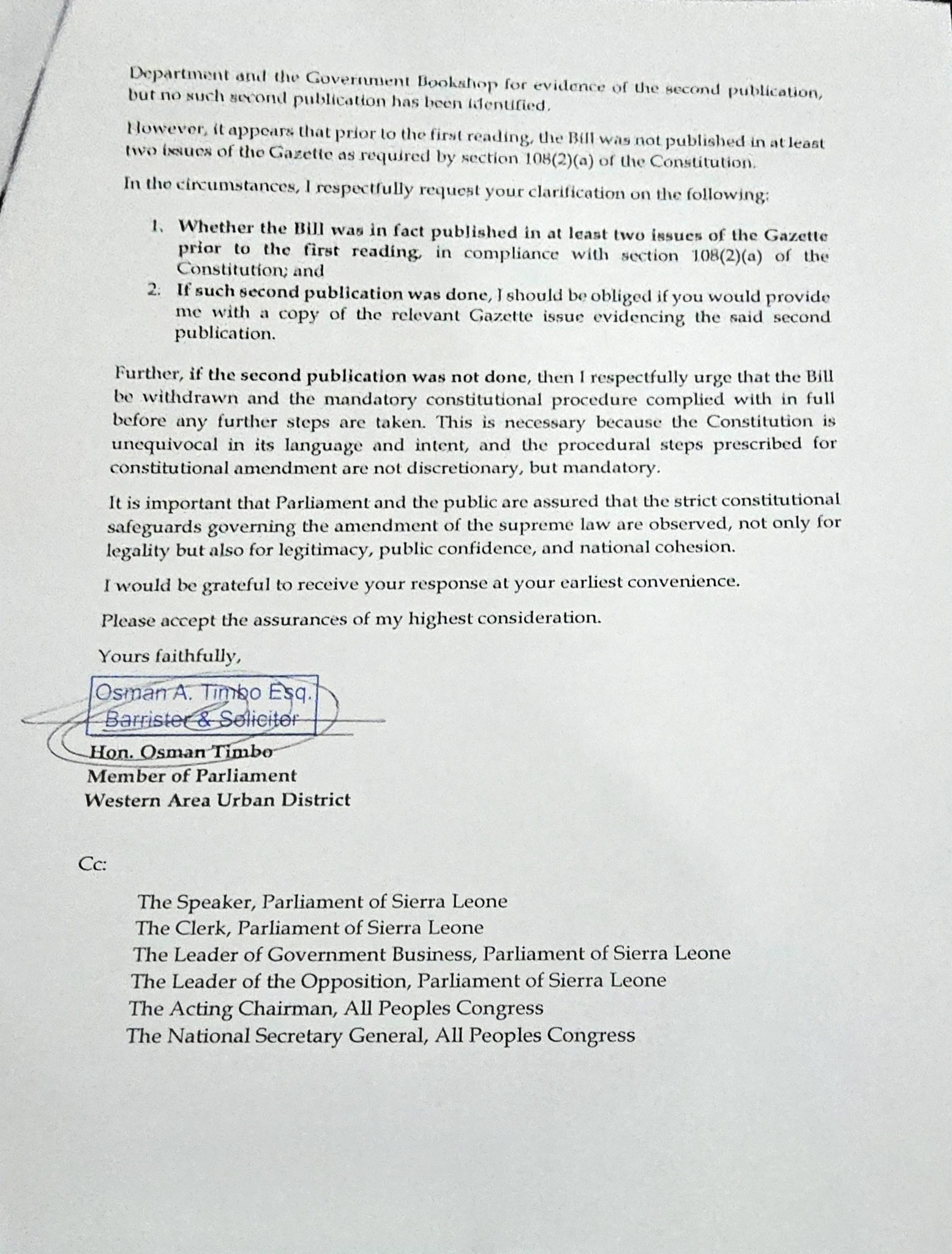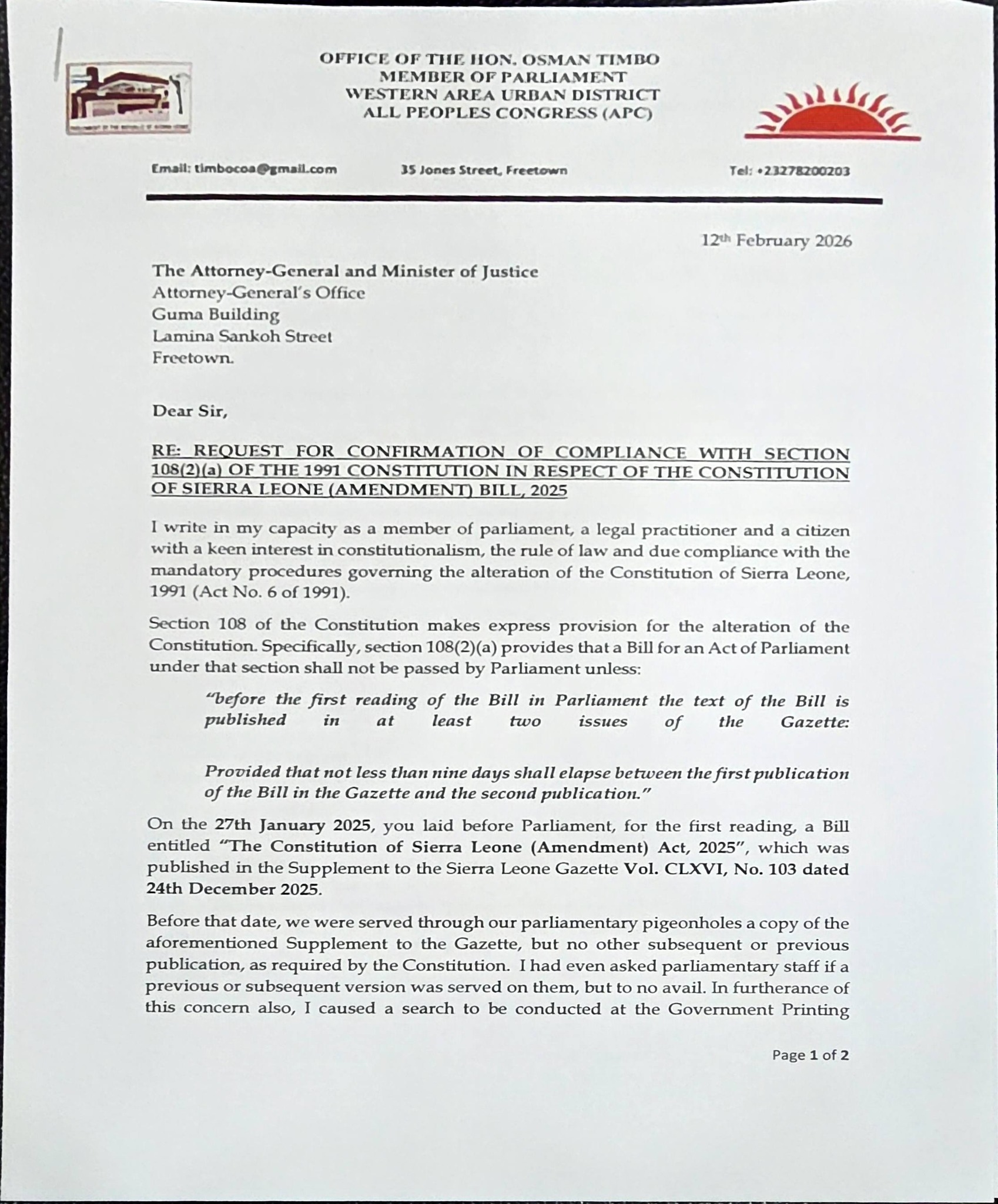 Osman Timbo, Opposition APC Member of Parliament for the Western Area Urban District, has raised serious concerns regarding the legality of the “Constitution of Sierra Leone (Amendment) Bill, 2025.” in a formal letter addressed to the Attorney-General and Minister of Justice, Alpha Sesay Esq.