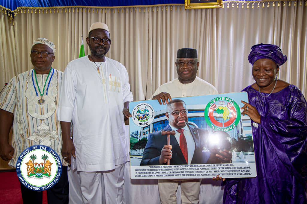 Speaking on behalf of the chiefs, Chairman of the National Council of Paramount Chiefs, Hon. PC Sheku Amada Tejan Fasuluku Sonsiama III, commended President Bio’s leadership and described his ECOWAS chairmanship as a significant achievement for Sierra Leone. The chiefs presented a commemorative plaque to mark the occasion and pledged their continued support to the President’s administration.