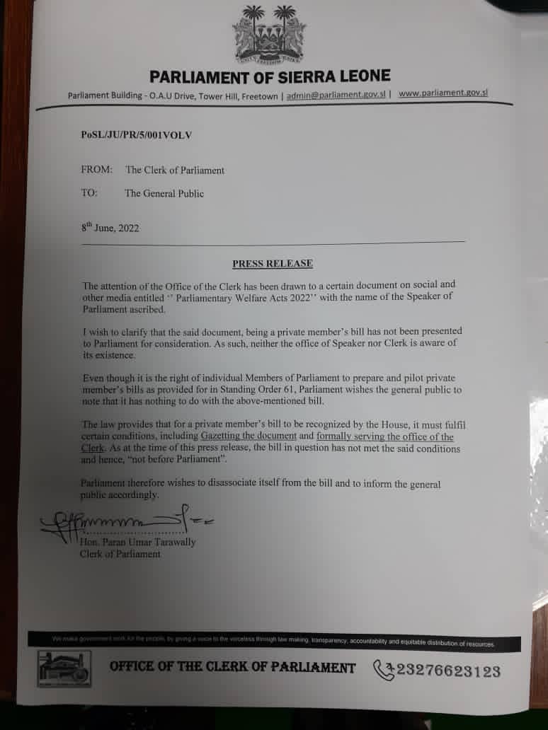 The Parliament of Sierra Leone has in a press release issued today debunked document circulating on social and other Media entitled “Parliamentary Welfare Act 2022″.