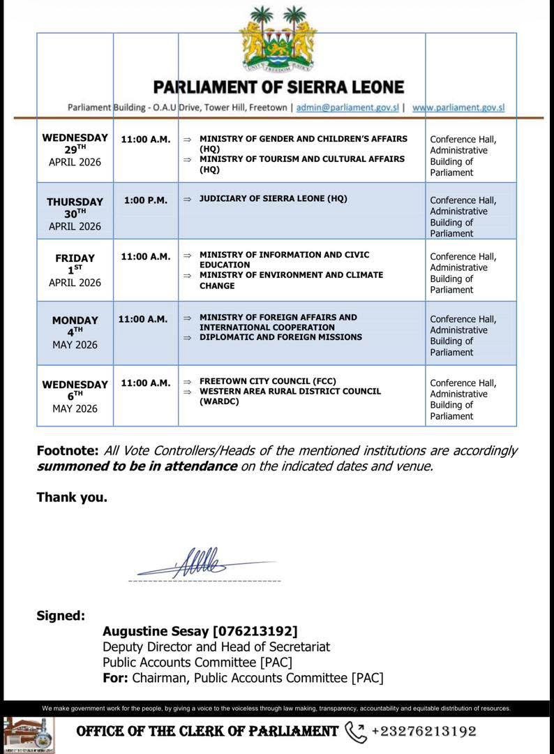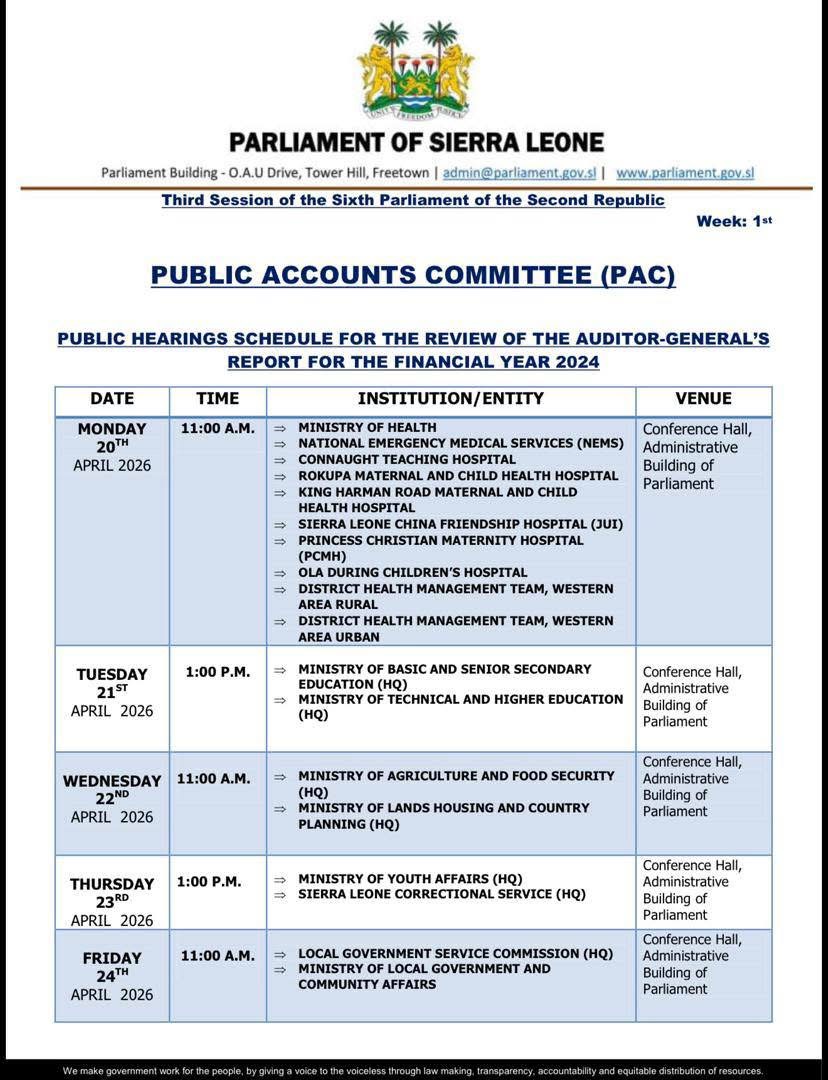 The Public Accounts Committee (PAC) of the Parliament of Sierra Leone has announced the commencement of public hearings on the Auditor-General’s Report for the 2024 financial year, as part of its constitutional oversight responsibilities.