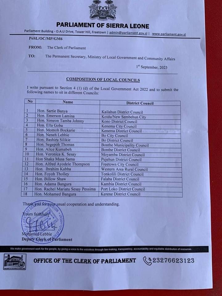The announcement was made through a letter signed by the Deputy Clerk of the Sierra Leone House of Parliament, Mọhamed Lebbie. This move underscores the government’s commitment to decentralization and empowering local authorities to address the unique needs and challenges of their respective communities.