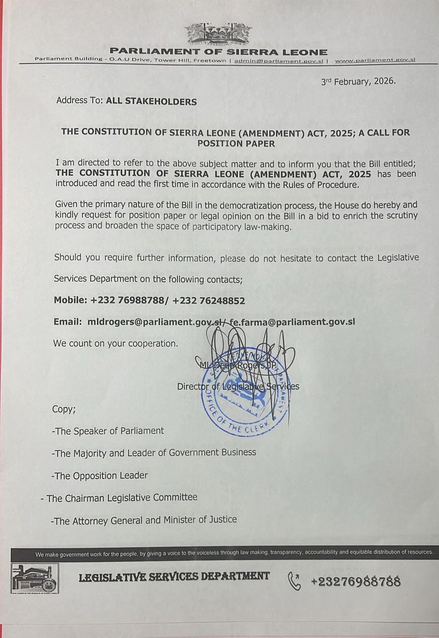 The Parliament of Sierra Leone has formally invited stakeholders to submit position papers or legal opinions on the proposed Constitution of Sierra Leone (Amendment) Act, 2025, as part of efforts to strengthen public participation in the law-making process.