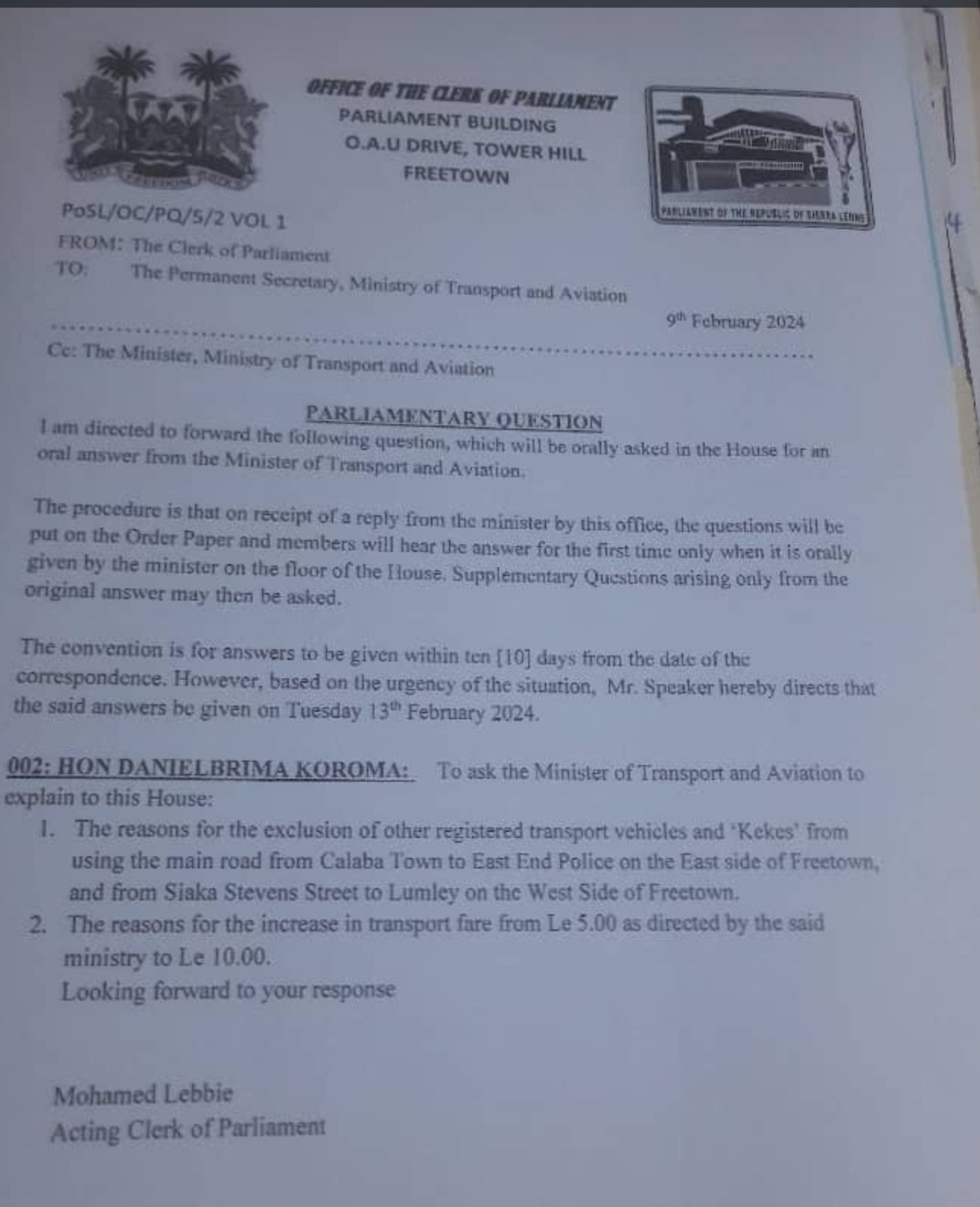 Parliament of Sierra Leone issued a query notice letter to the Minister of Transport and Aviation demanding an explanation regarding the exclusion of commercial transport plying certain streets in the capital Freetown.