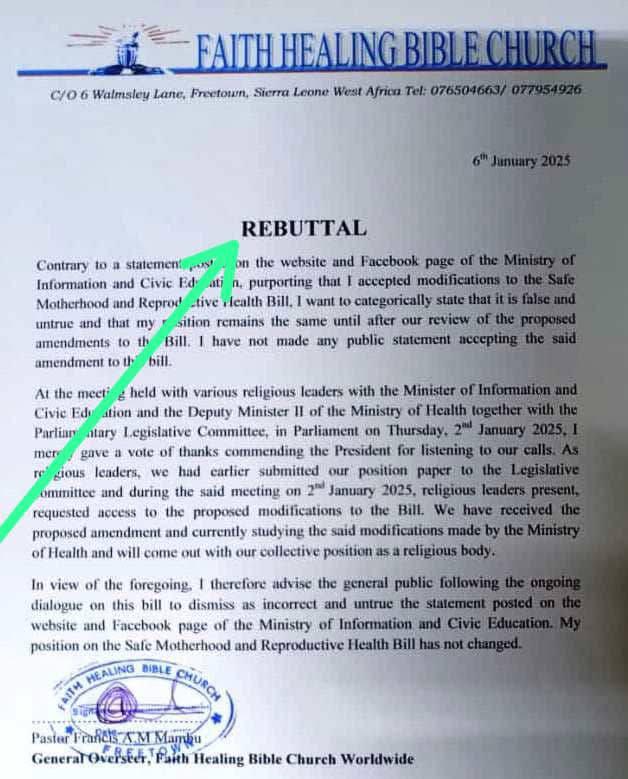 Pastor Francis A.M Mambu, General Overseer of the Faith Healing Bible Church, has denied accepting modifications to the Safe Motherhood and Reproductive Health Bill.