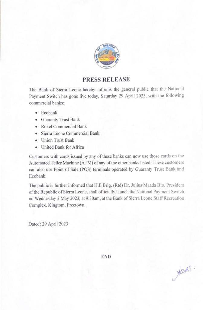 The National Payment Switch will be officially launched by the President of the Republic of Sierra Leone, Julius Maada Bio, on Wednesday 3 May 2023, at 9:30am, at the Bank of Sierra Leone Staff Recreation Complex, Kingtom, Freetown.