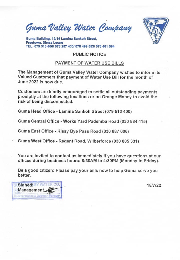 The Management of Guma Valley Water Company has informed its valued customers that payment of Water Use Bill for the month of June 2022 is now due.