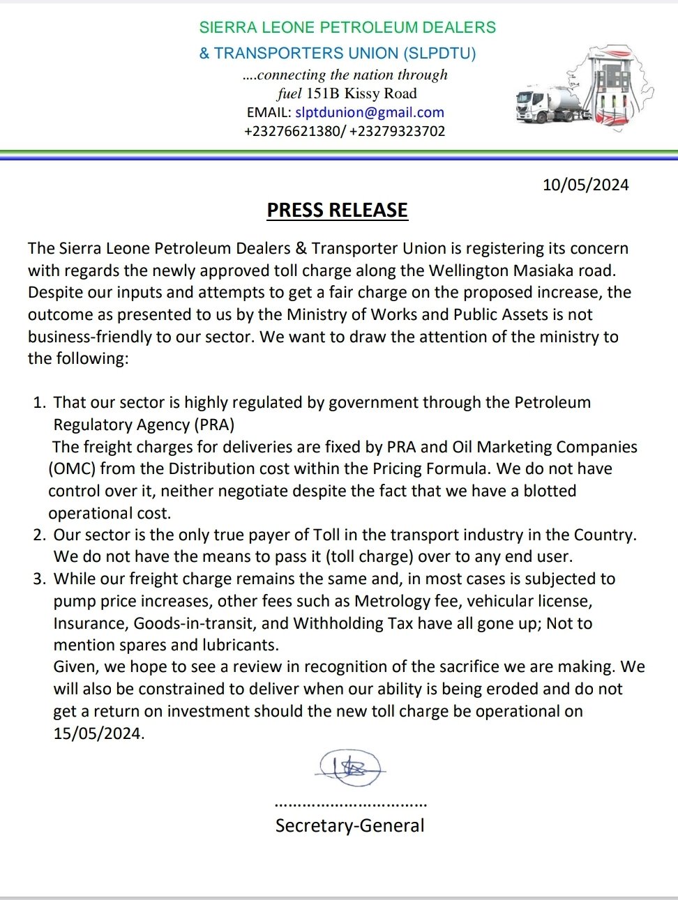 The Sierra Leone Petroleum Dealers & Transporter Union (SLPDTU) is raising concerns about the recently approved toll charge for the Wellington Masiaka road.