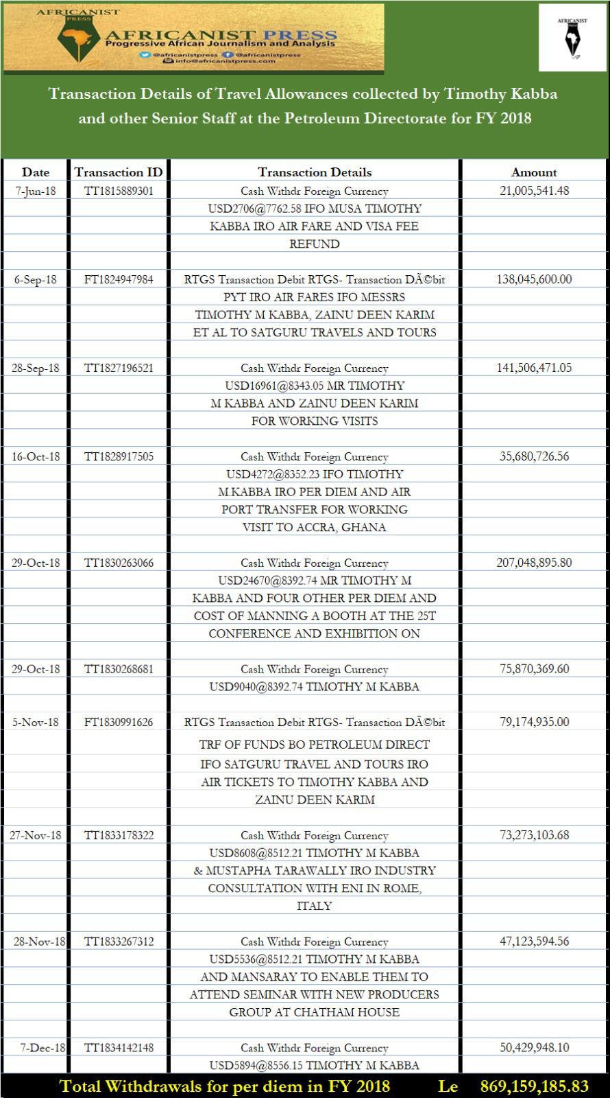 Transaction details from bank records of the Petroleum Directorate  for fiscal year 2018 shows that newly appointed senior staff of the agency withdrew a total of Le869,159,185.83 as travel per diem alone, between 7th June 2018 and 7th December 2018; during the first six months of the Maada Bio regime.