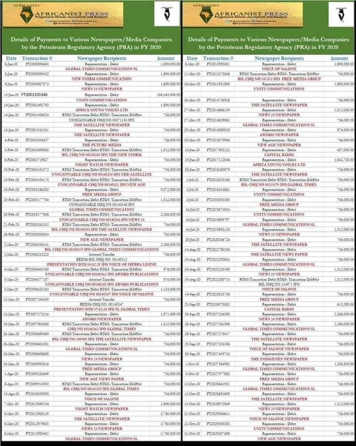 The Africanist Press further pointed out that the transaction records of the Petroleum Regulatory Agency (PRA) provides no details on how the said newspapers and media companies were selected or contracted to provide the stated services for which the listed amounts were paid to them, raising questions as to why the selected newspapers were the only ones receiving the recurring payments despite the flood of other regularly printed newspapers in circulation in Sierra Leone.