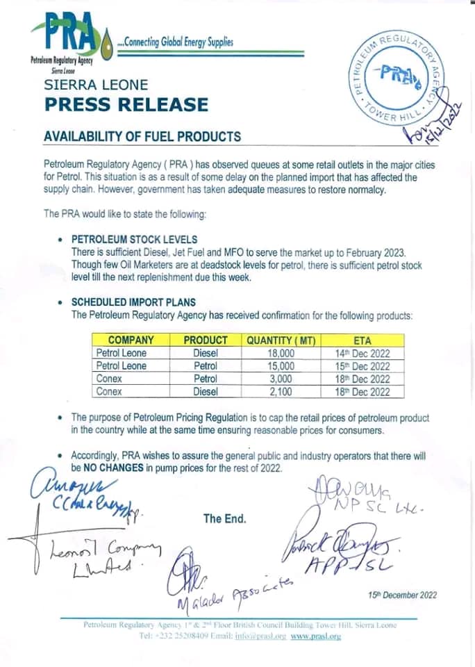 Sierra leone’s Petroleum Regulatory Agency (PRA) has assured of the availability of petroleum products to serve residents throughout the festive season and beyond.