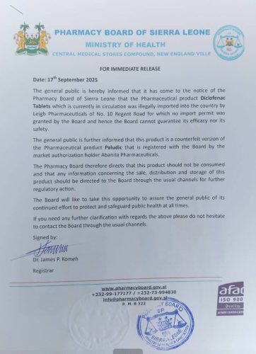 In a press release dated September 17, 2025, the Pharmacy Board of Sierra Leone cautioned the public against the use of Diclofenac Tablets imported by Leigh Pharmaceuticals, located at No. 10 Regent Road, Freetown.