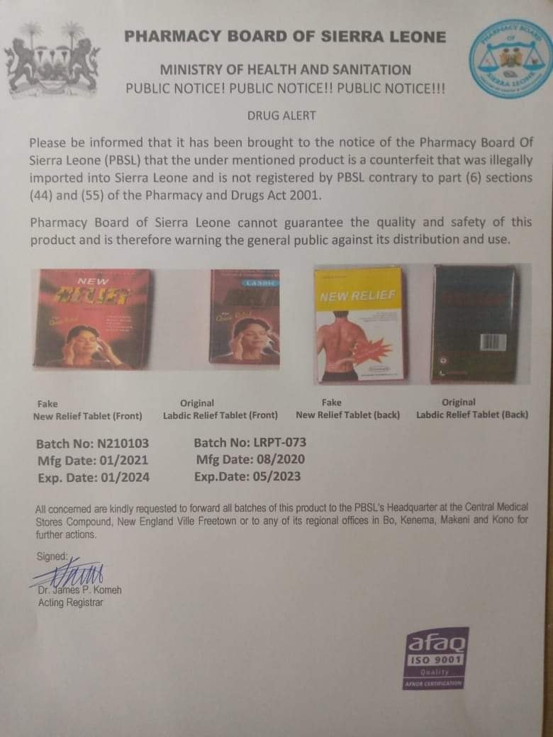 In the public notice the Pharmacy Board of Sierra Leone (PBSL) informed the unsuspecting public that the administration of the board has noticed that some counterfeit products were illegally imported into the country and are not registered by the PBSL according to law contrary to part (6) sections (44) and (55) of the pharmacy and drugs act of 2001.